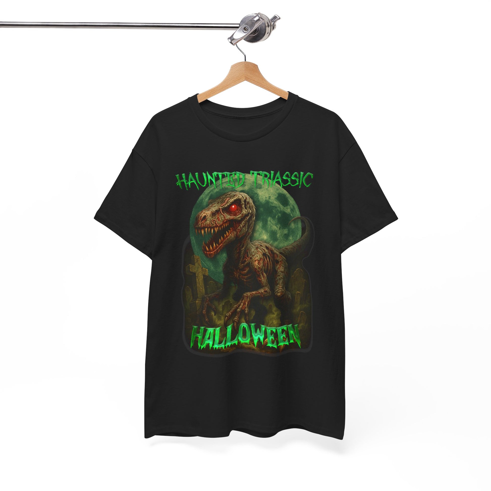 Enter the Haunted Triassic — where a Velociraptor stalks through a foggy Halloween cemetery. Gothic, eerie, and prehistoric all at once.